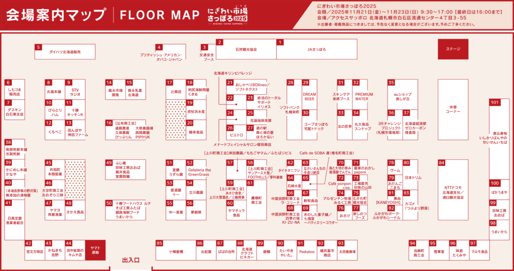 〒003-0030札幌市白石区流通センター4丁目3-55お問い合せ / 011-865-5811(平日9時〜17時)Mail / nigiwai-ichiba-sapporo@axes.or.jp